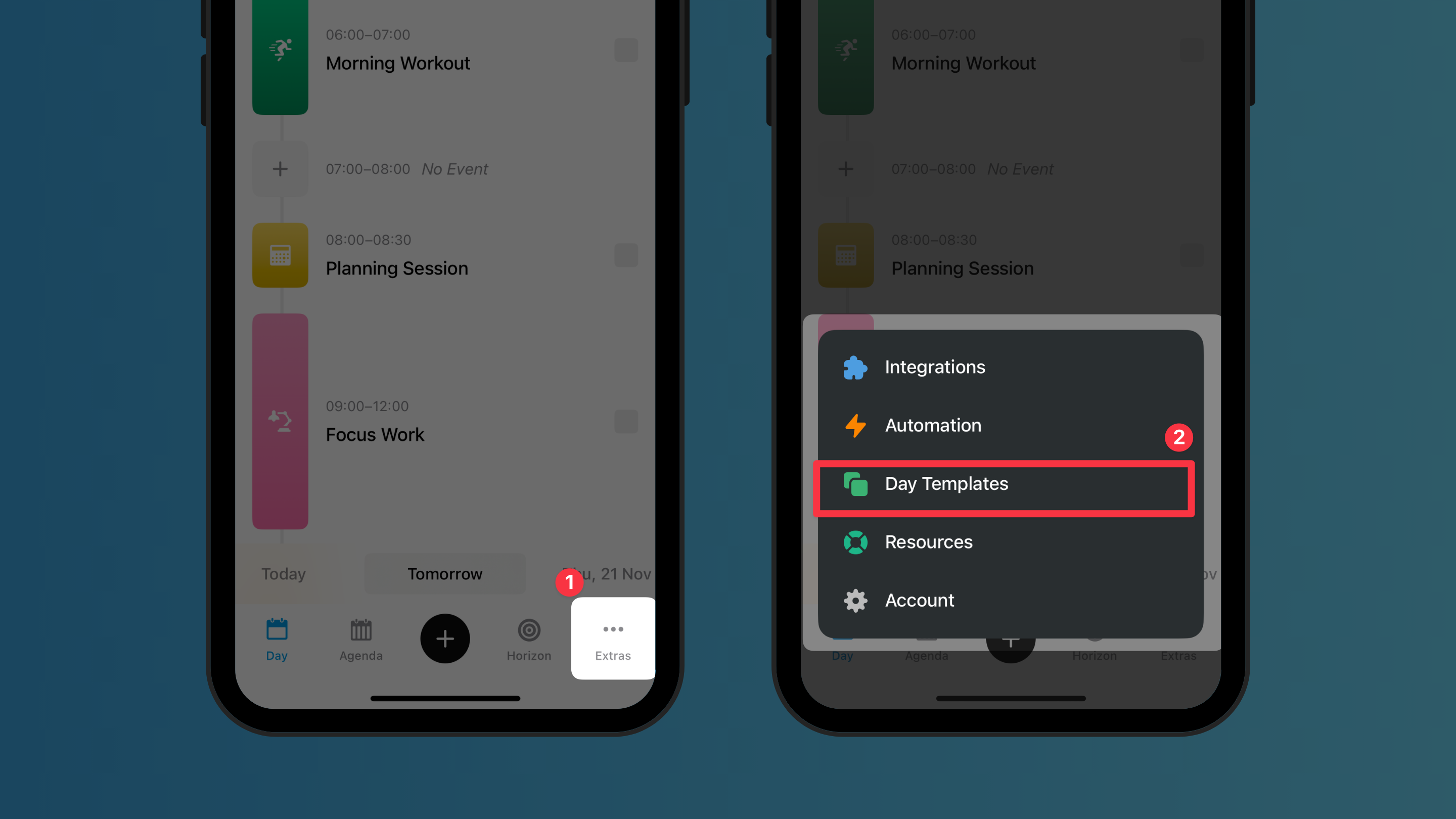 Day templates are pre-designed daily schedules that you can reuse whenever needed. They help you maintain consistency in your daily routine and save time on repetitive planning.