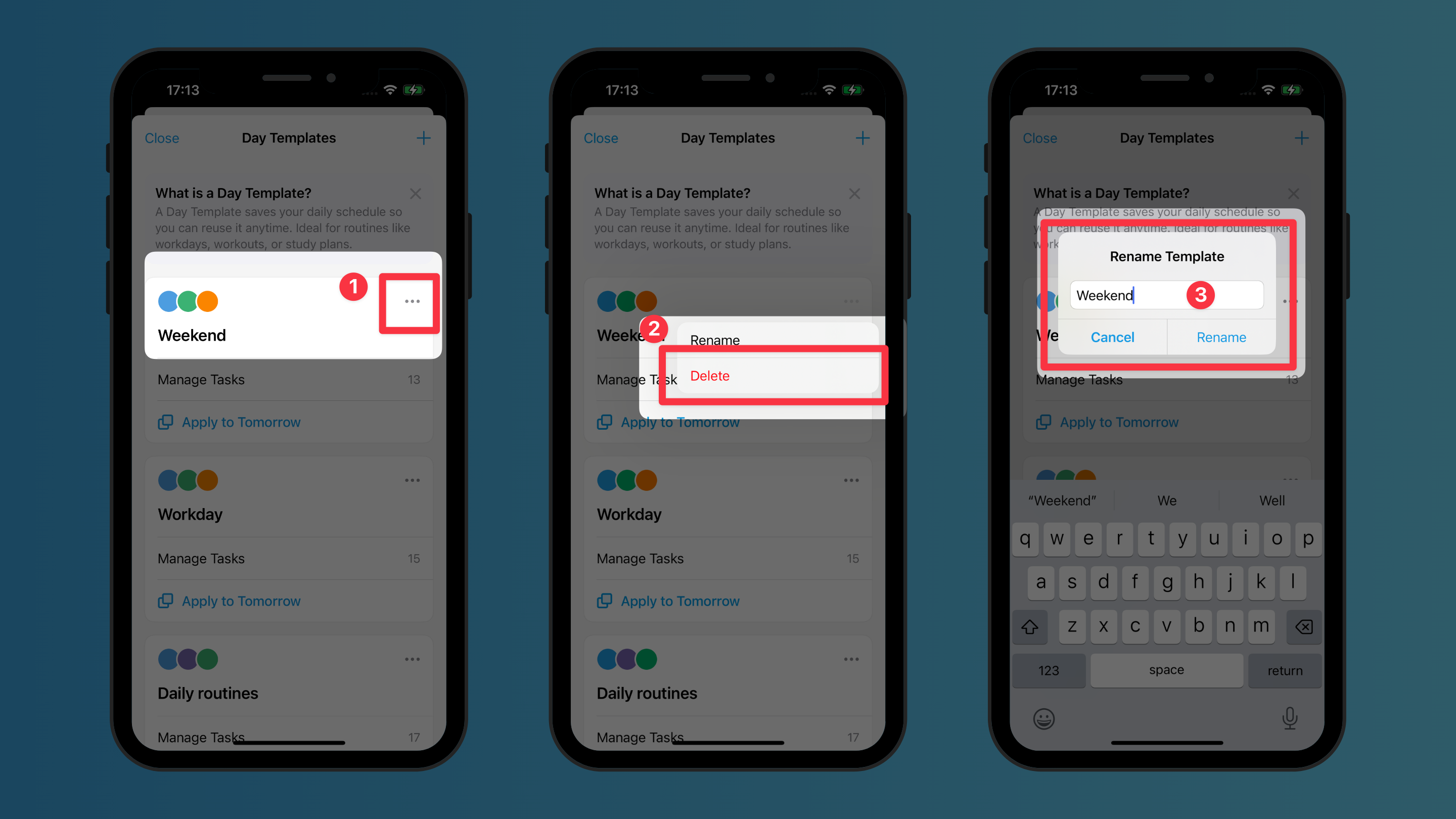 • To change the template's name: Tap on the 3-dot menu button > Rename, and change the name of your template