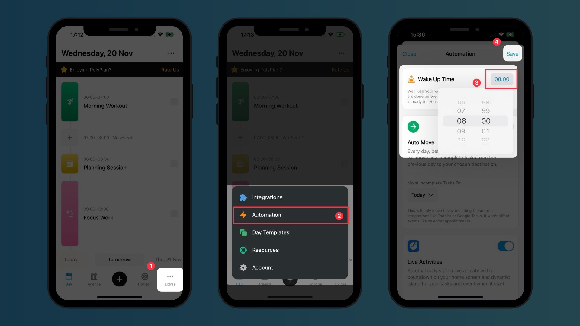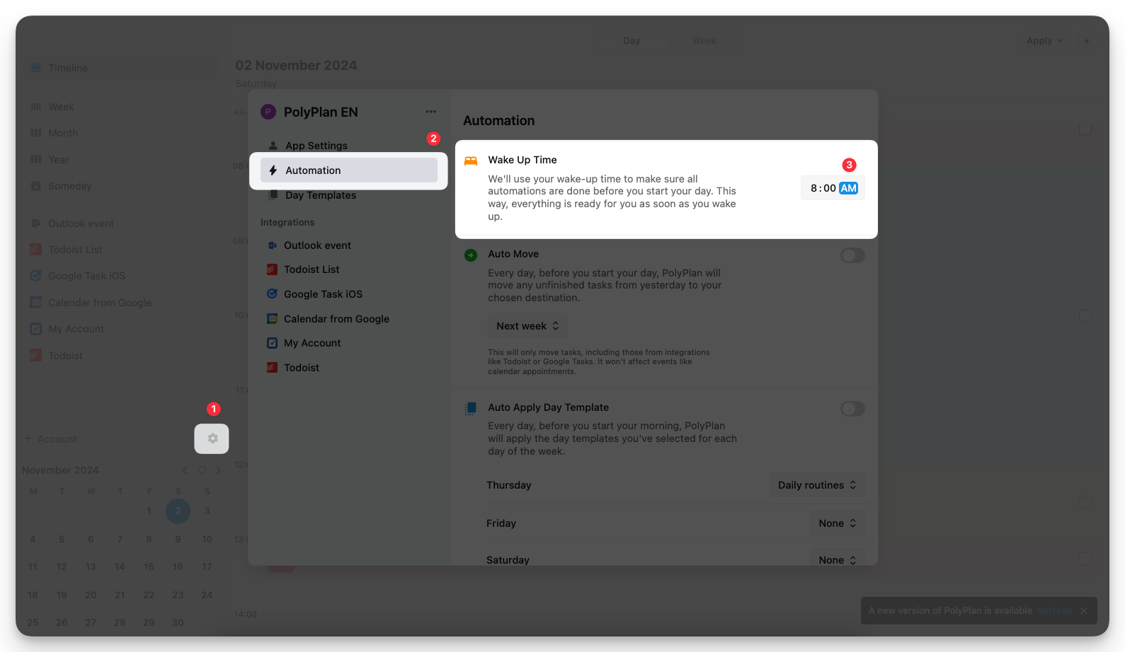 The Wake-up Time feature allows PolyPlan to prepare your daily automations before you start your day, ensuring everything is ready the moment you wake up.