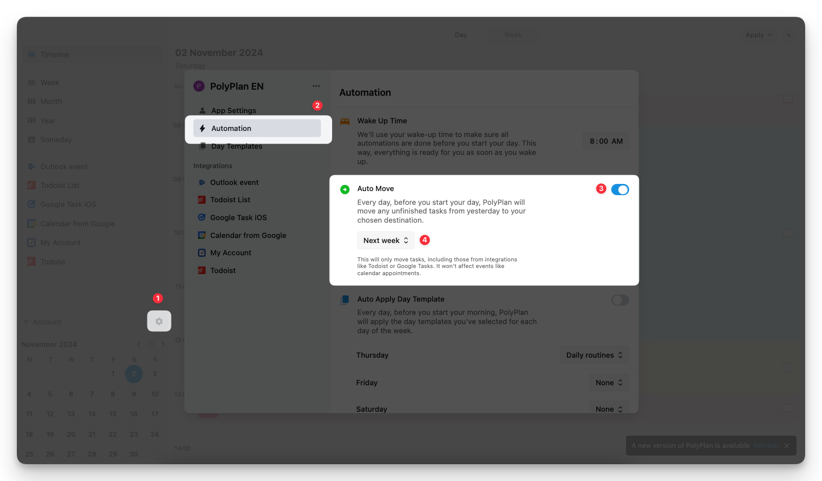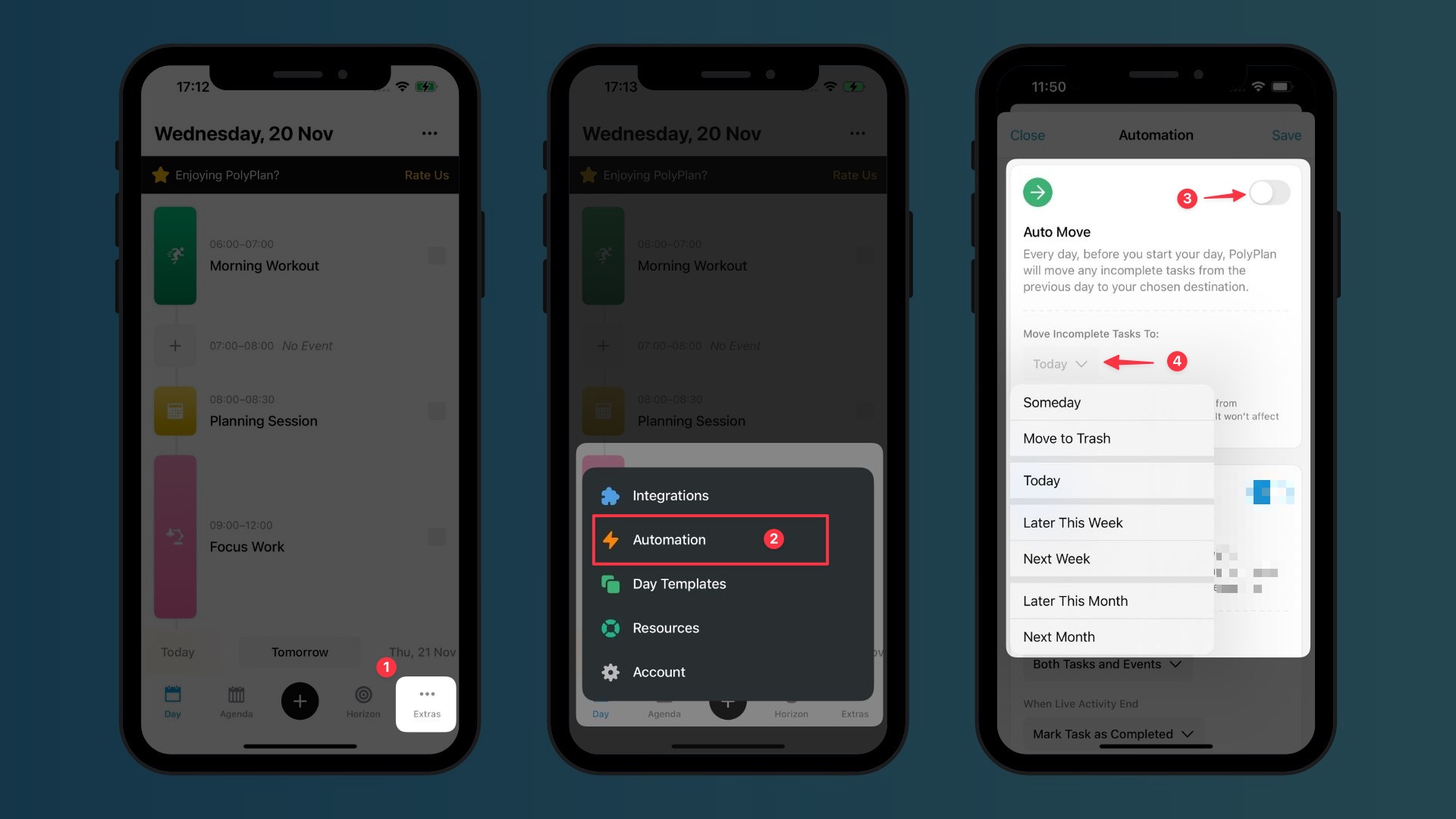 Auto Move is an intelligent automation feature that handles your incomplete tasks before you start your day. Every morning, before your wake-up time, PolyPlan automatically relocates any unfinished tasks from the previous day according to your preferences.